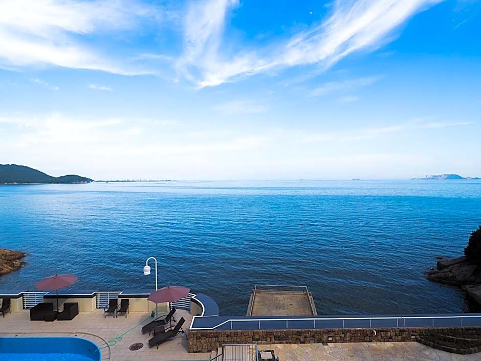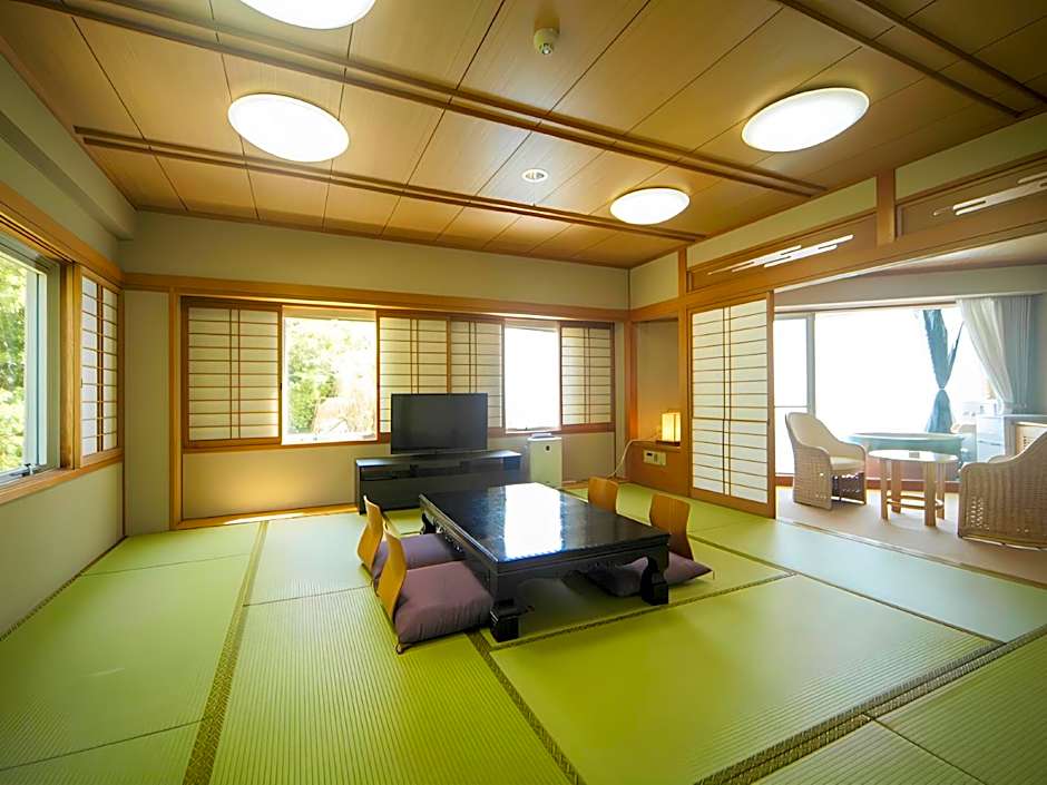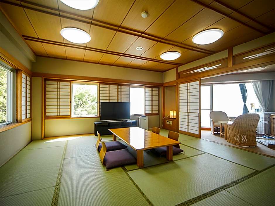 The pool with a view and private open-air bath are the special features of this family room. The spacious family room provides air conditioning, tatami, a balcony with sea views as well as a private bathroom featuring a bath. The unit offers 6 futons.